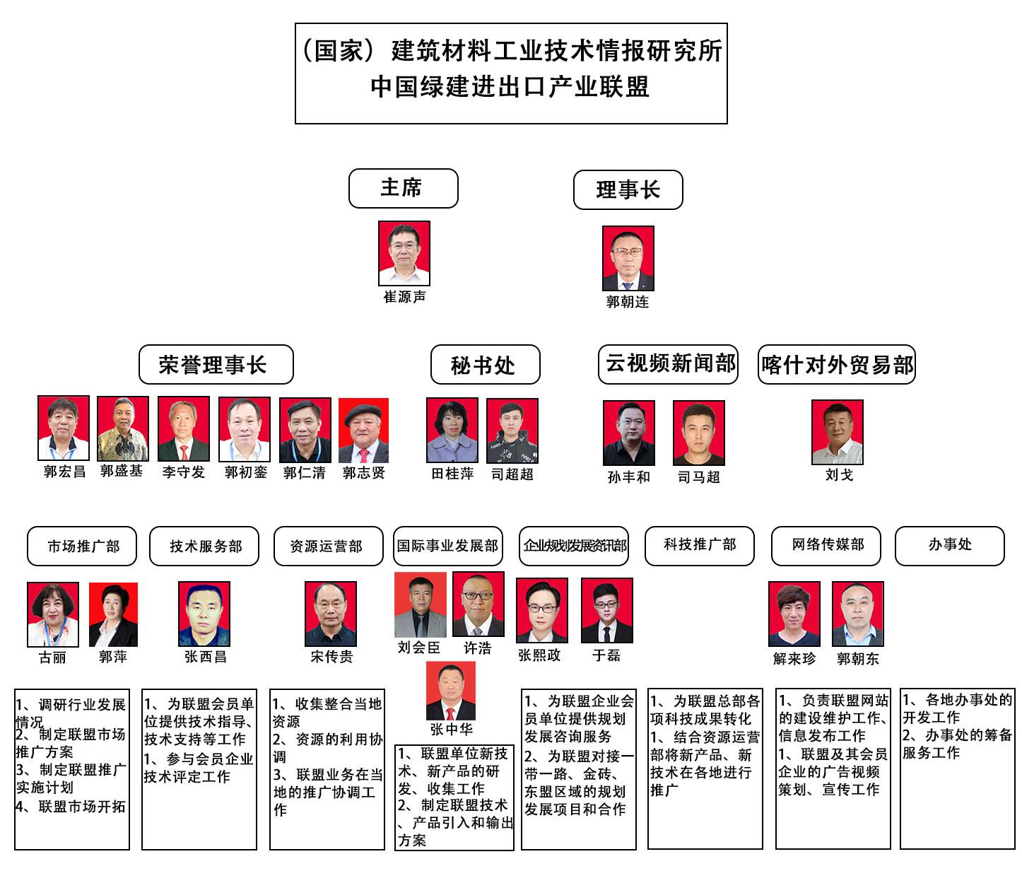 是由(國家)建筑材料工業技術情報研究所批準,由國際綠建行業的企事業單位、行業相關聯的高等院校、科研機構及行業協會共同組成的國際性綠色建筑建材行業進出口領域的產業聯盟。國際平臺搭建;聯合外交部;貿促會;商務部;國際商會;開展國際商務推介平臺;國內協同企業建材檢測認證;標準制定;科技成果評估及產品推廣等服務。